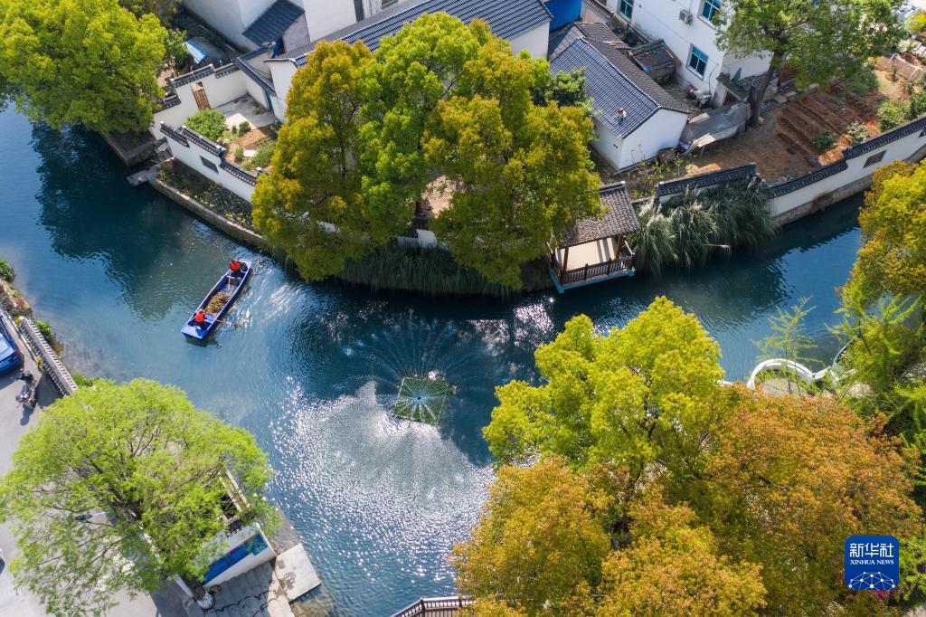 在浙江省长兴县龙山街道渚山村,保洁人员进行日常河道护理巡查(2020年4月9日摄,无人机照片)。新华社记者 徐昱 摄
