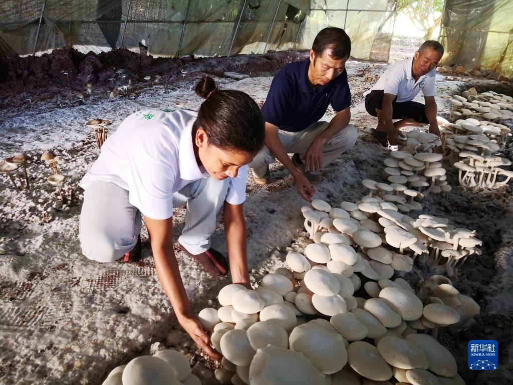 2018年6月12日,在斐济楠迪,中国专家和当地雇员检查菌菇生长情况。新华社记者张永兴 摄