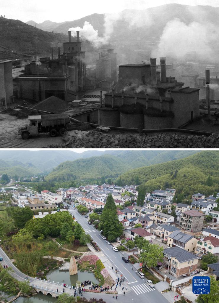 这是一张拼版照片,上图为:浙江省湖州市安吉县天荒坪镇余村二十世纪八十年代的资料照片;下图为:2018年4月24日,游客在整修一新的余村游览(新华社记者翁忻旸 摄)。新华社发