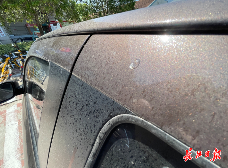 车身上落满黏液,多数都是芝麻大小的点状,少数黏液滴较大,堪比黄豆大小。记者杨荣峰摄