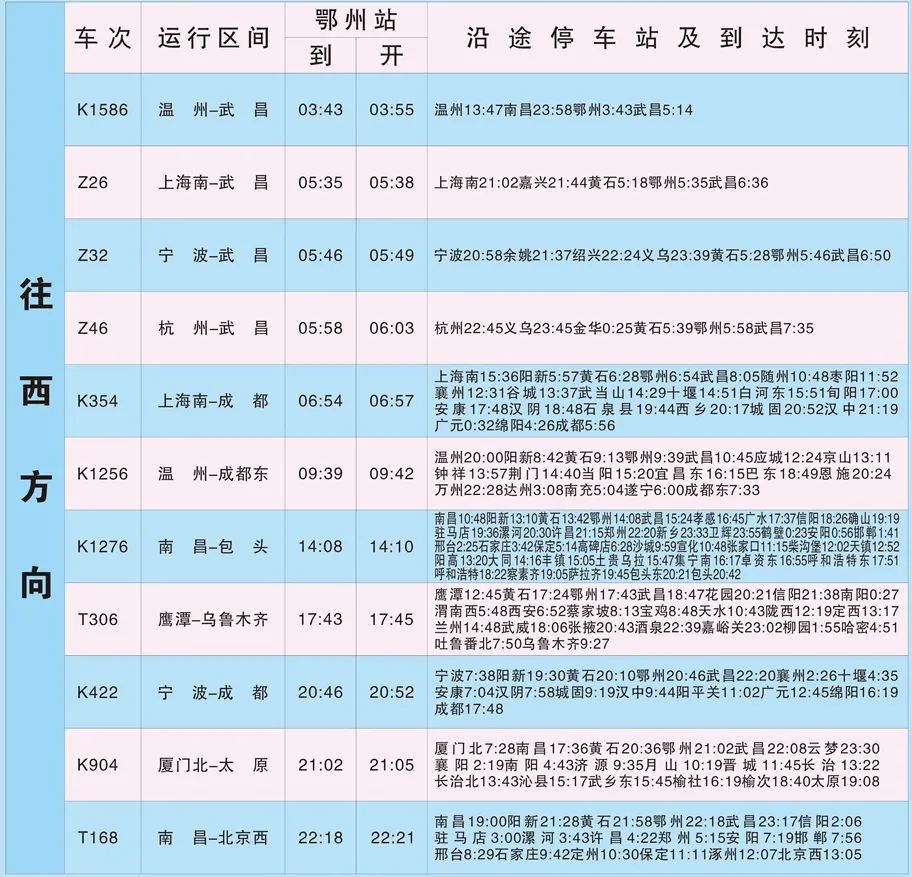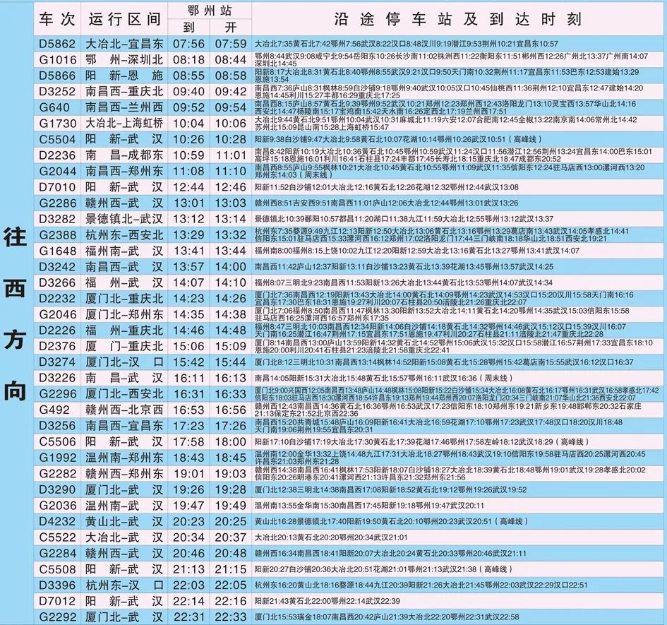 此次调图鄂州站既有线列车停点变化7趟,调整运行区段2趟;武九客专线列车停点发生变化10趟,新增停点4趟,取消停点1趟,调整运行区段3趟。