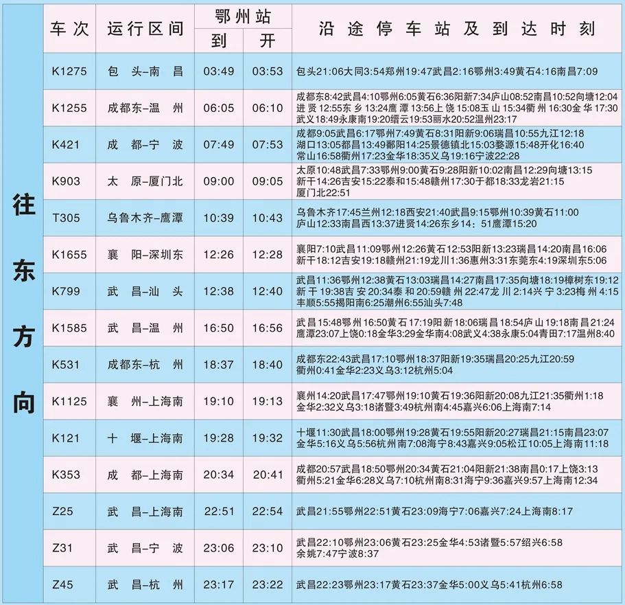 据鄂州火车站介绍,从10月11日零时起,根据全国铁路启用的新列车运行图,鄂州站列车运行将相应做出调整。有出行计划的旅客请及时关注,调整乘车计划。
