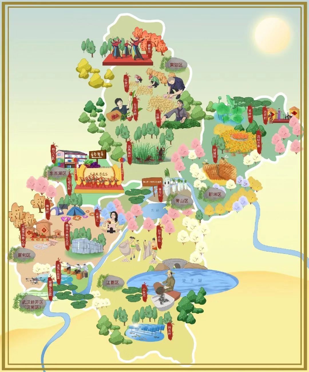 蔡甸区是莲藕之乡,划船赏荷、采莲挖藕成为市民必去之所,“全藕宴”引人垂涎;新洲区文脉绵延,问津书院远近闻名,三店街非遗文化让市民眼前一亮;黄陂区木兰系列景区好戏连台,自然风光与游乐活动相得益彰,成为名副其实的“武汉后花园”;东西湖区移民文化深厚,很多湖泊山岗、防汛堤段变身乡游景点,凸显湖乡巨变和拓荒精神;江夏区农运会喜庆举行,乡村运动品种丰富,别具特色;武汉经开区(汉南区)生态良好,绿色农产品通过视频直播远销全国;青山区“建设萝卜”素有美名,眼下借助现代农业科技,正在开启品牌复兴之路。