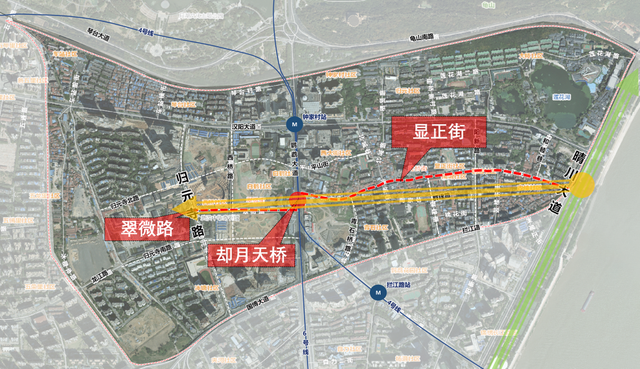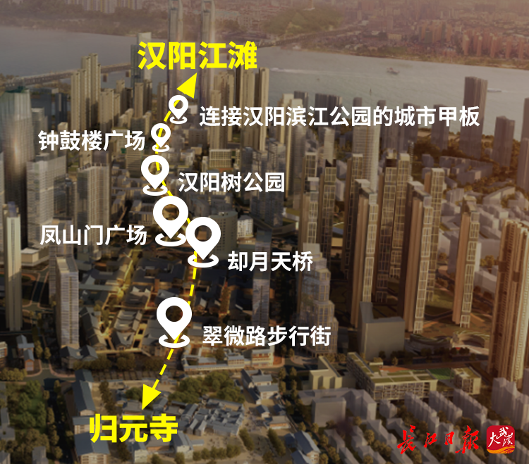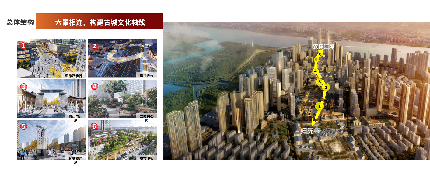 汉阳古城文化轴建设项目将建立起一条从归元寺至汉阳滨江公园的1800米全线段步行系统。这条西起归元寺路、东至晴川大道的古今交融文化商业中心轴,整体打造翠微路、却月天桥、显正街,将增设翠微路步行街、却月天桥、凤山门广场、汉阳树公园、钟鼓楼广场,以及连接汉阳滨江公园的城市甲板六大景观节点。