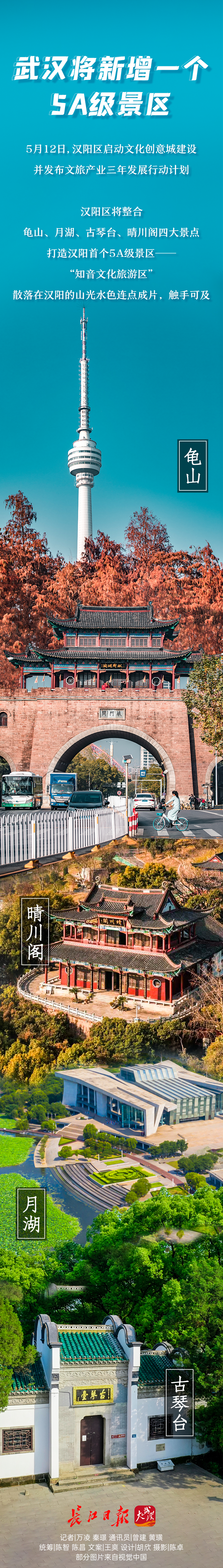 汉阳区文化和旅游局负责人介绍,汉阳区将整合龟山、月湖、古琴台、晴川阁四大景点,打造汉阳首个5A级景区,即“知音文化旅游区”,按照国家相关标准全面提升景区的硬件设施和服务品质。