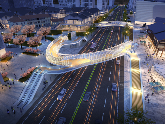 却月天桥横跨鹦鹉大道,将通过艺术景观天桥连接翠微路与显正街步行系统,同时串联周边远洋商区、中海商区、福星惠誉商区,汇聚成古城商业圈。