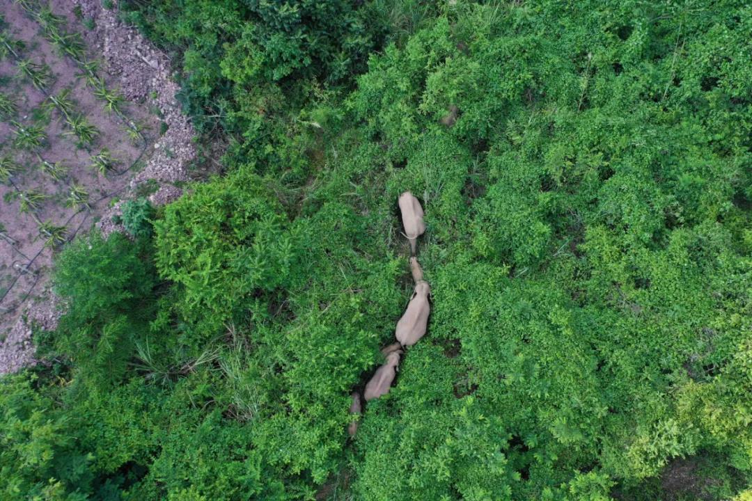 2021年5月20日,野象群北上途经云南石屏北部山区,穿越山地丛林及火龙果地。