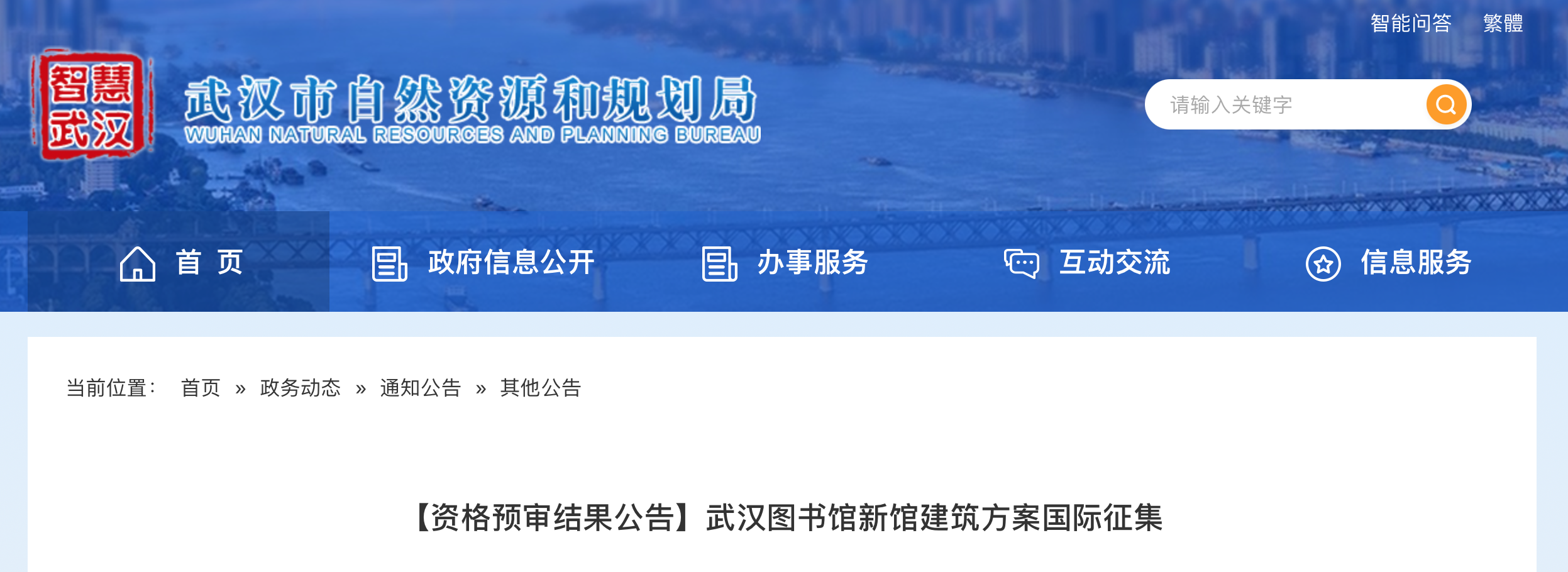 5月13日,武汉市自然资源和规划局发布武汉图书馆新馆建筑方案国际征集的资格预审结果公告。