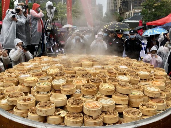 “天下第一蒸”在武汉汉街大戏台前开笼。记者张珺 摄