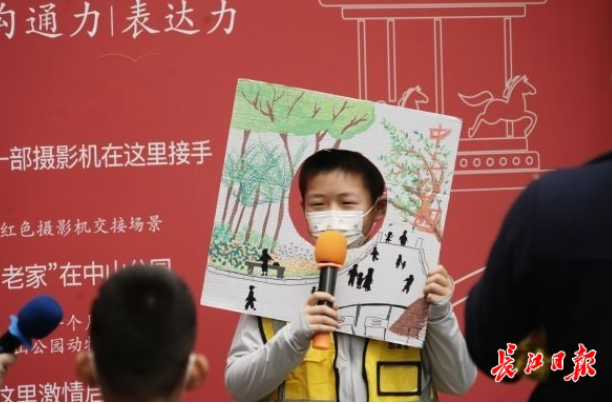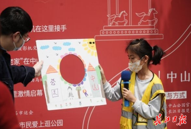 你对中山公园的游园记忆,是怎样的呢?小学生在叨叨的指引下,分别抽题卡,根据卡片的提示,画一幅中山公园里的小故事。“我抽到的题目是:中山公园是什么颜色和气味的。中山公园郁郁葱葱的花坛让我印象很深刻,空气里都是花的香味,游人会走在花坛旁边的拱桥上,慢慢欣赏。”万科高尔夫小学三年级王赫轩的绘画故事,引起了大家的共鸣,曾经是东西湖区“艺术小人才”一等奖获得者,将心目中对中山公园的印象具象化。“脑海里边有画面,才能讲出好故事。”叨叨启发孩子们平常多关注身边的细节。