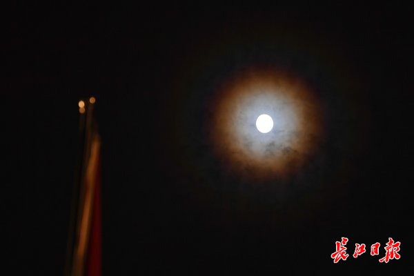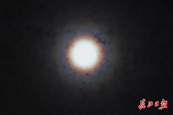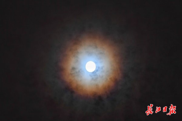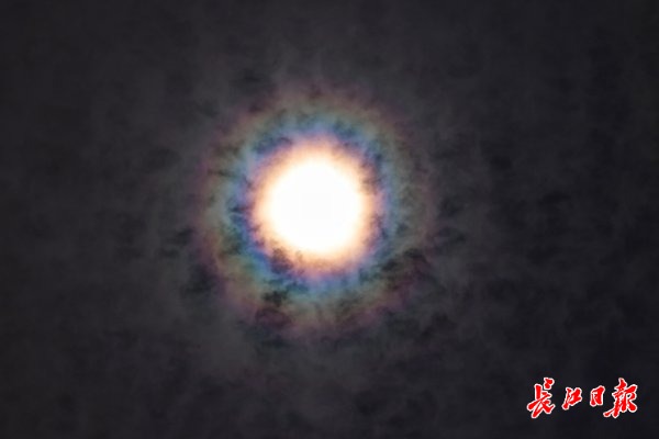 长江日报大武汉客户端10月18日讯 18日21时10分,武汉市夜空出现美丽月晕。明朗夜空中,月亮周围出现几层彩色光晕,五彩斑斓,形成一幅美丽画面,吸引众多市民纷纷驻足观看。约20分钟后,月晕消失在夜空中。