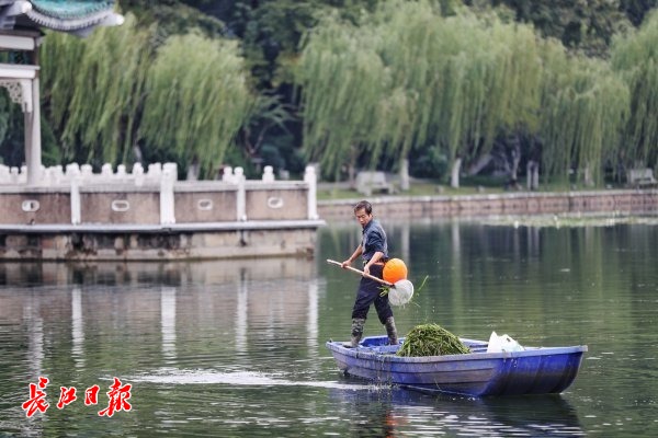 工作人员清理水中的杂草。 记者何晓刚 詹松 李永刚 摄