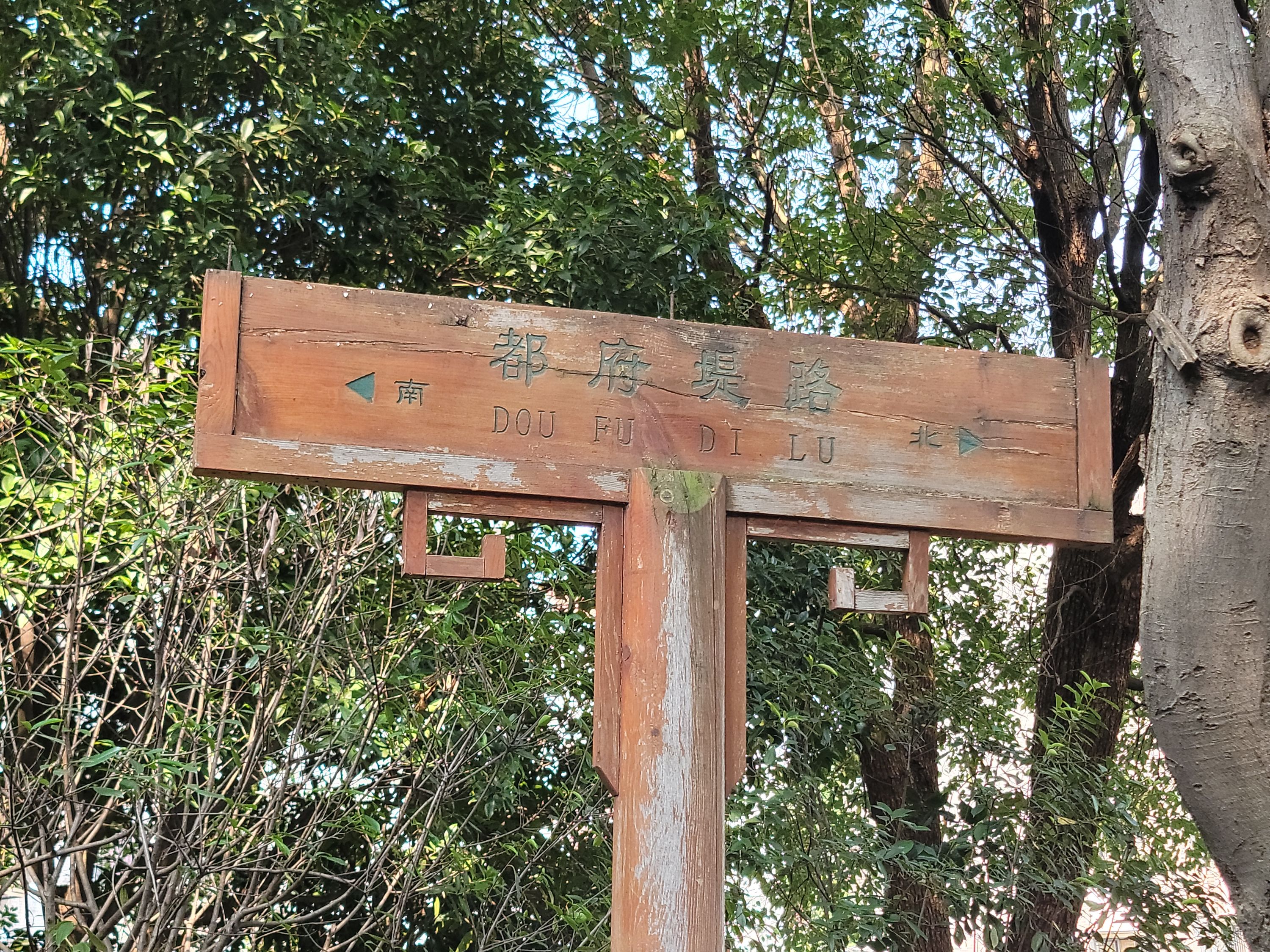 长江日报记者在现场看到,木牌和金属牌上都是南北指向,其中木牌上显示为“都府堤路”,下方拼音“dou fu di lu”;金属牌上显示为“都府堤”,下方拼音“du fu di”。