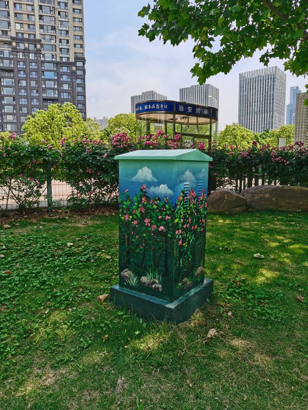 长江日报大武汉客户端5月17日讯(记者詹丽 通讯员张虹)17日,在沙湖公园琴园(A区)散步的胡女士惊喜发现,公园里的配电箱一改往日“素颜”,画上了精致的“油画妆”——挺直的翠竹整齐排列在小路两侧,娇艳的繁花点缀其中,与公园美景交相呼应,“这里本就竹林茂密成荫,真是和美景融合到一起了!”