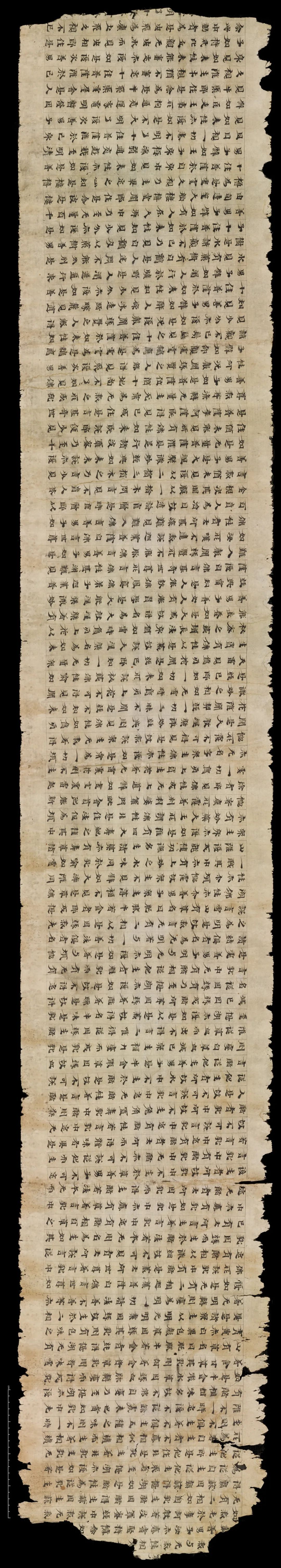 此卷为佛经写本。首尾俱残,白麻纸,每纸27行,行17字,共101行。乌丝栏纤细规整,墨色浓黑而有光泽,书法保持了较多的隶书气息,字体结构也如隶书扁平状,书写工整,灵动潇洒,是北朝时期敦煌写经中的精品。