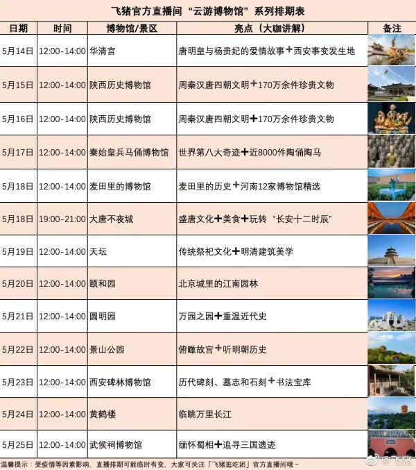“云游博物馆”系列直播时间为每日12:00-14:00,用户在飞猪旅行App、淘宝App中搜索“飞猪逛吃团”即可观看相应直播及回放。