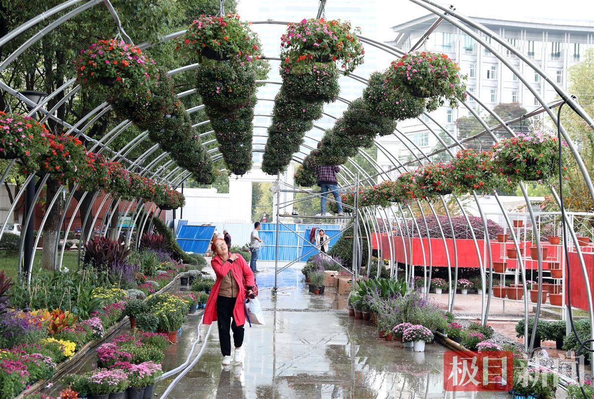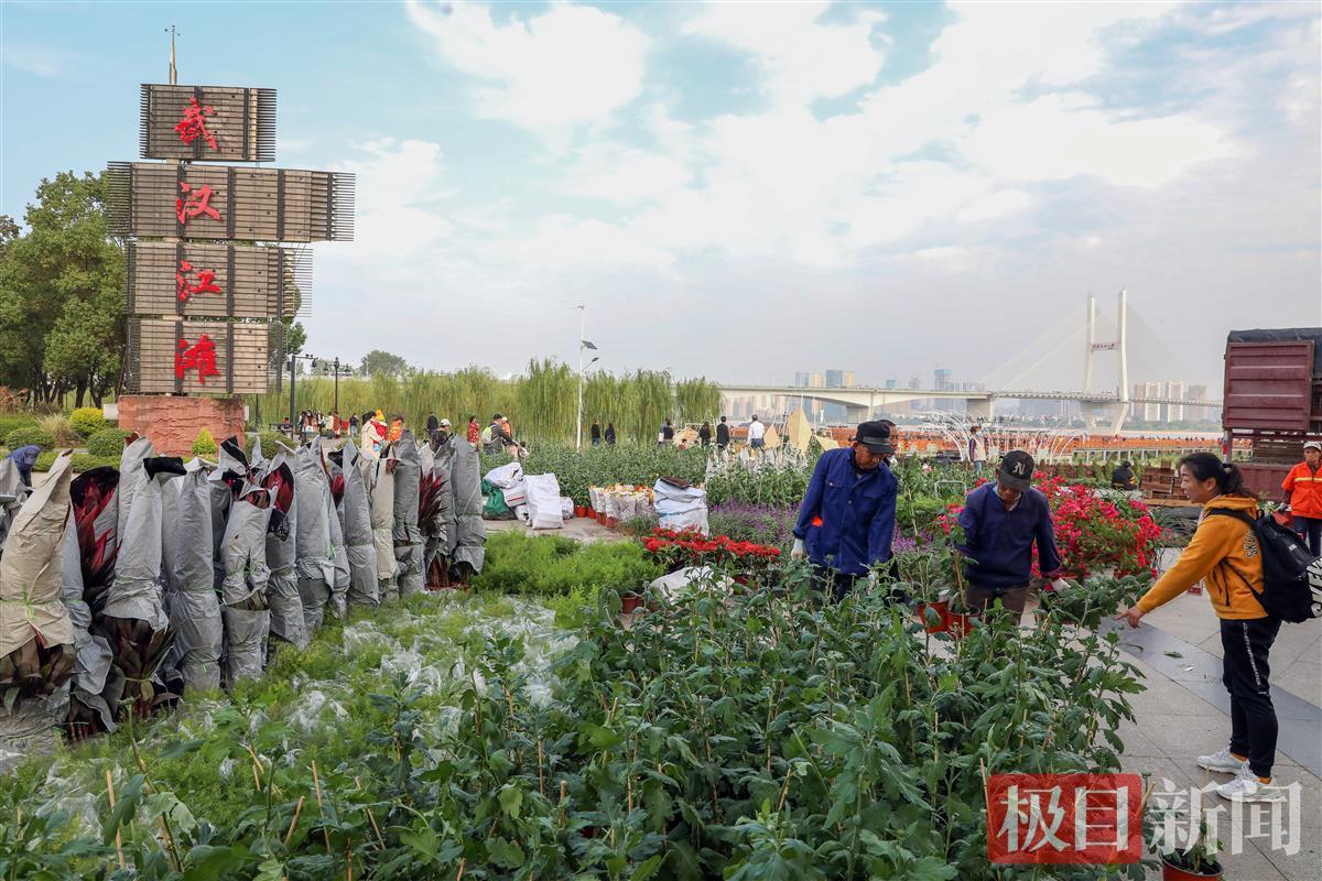 2021武汉第38届金秋菊展将于10月28日开展,汉口江滩作为菊展会场之一,正在火热布展。昨日,记者在汉口江滩风帆广场看到,工作人员正紧张搭建菊花展台,数千盆菊花陆续进行布置摆放,各类菊花色彩斑斓、奇姿异彩,各种扎景造型设计新颖精巧,吸引现场不少市民前来观赏,提前尝鲜。