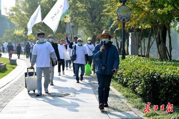 长江日报大武汉客户端10月24日讯 “原来我们的城市中心栖息着如此丰富的动植物,保护生态太重要了!”10月24日上午,伴着秋日暖阳,2021年“江湖卫士”Plogging公益行动走进美丽的沙湖公园,百名公益环保爱好者统一着装,环湖开展健身游,大家一同捡垃圾传递环保理念,一同认识动植物学习环保知识。