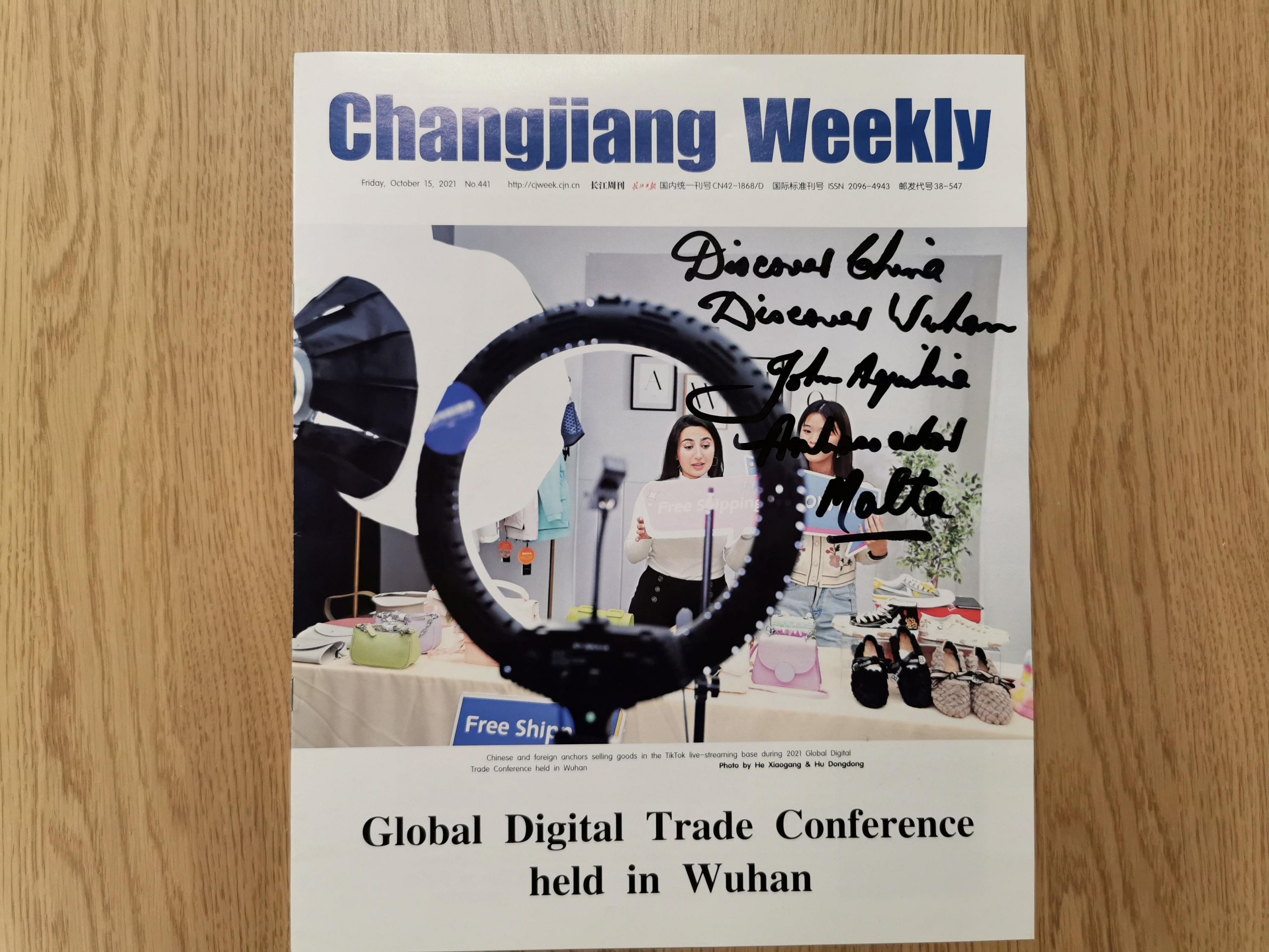 ▲ John Aquilina writes on the cover of a copy of the Changjiang Weekly: "Discover China Discover Wuhan."