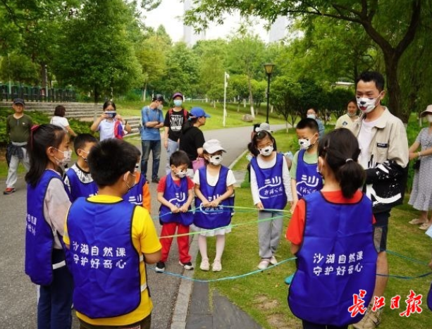 随着温度攀升,公园里的昆虫们也越发热闹,蝴蝶、蜜蜂、豆娘、蚂蚁等各类昆虫在草丛、湖边奔走忙碌,多彩的生命构成沙湖公园独一无二的自然生境。在生态系统中,每个物种都有着自己的生态位,担任着重要角色,每位同学都变身为一个自然物种,大家手持卷线,模拟自然界中的物种关系。“植物是生态系统里的生产者,吃植物的昆虫被称为消费者。”黄俊铭引导孩子们思考自己所代表的的物种在自然界中吃与被吃的关系,同学们手中的卷线交叉又折叠,循环往复几次后,化身成一张巨大的网。有的同学尝试拉了拉手中的卷线,身处其他位置的同学也感受到了拉扯感,“各种各样的物种构成自然生态,如果有一个物种消失,将牵一发而动全身,生态系统也将受到影响。”就读于武汉市梨园小学的张逸非松开手,精密的“生态系统网”瞬间塌下去一角,稳定不再。