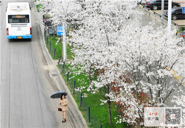 3月22日,光谷珞喻东路大黄村公交车站掩映在盛开的樱花树下,花瓣随风飞舞,车站两旁形成六十米樱花带,人们在此乘车赏花两相宜。 记者高勇 摄