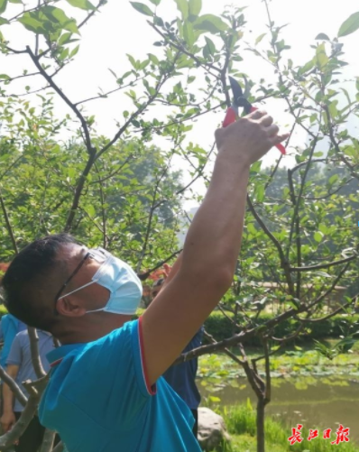 解放公园管理人员体验垂丝海棠花后修剪。 记者明眺生摄