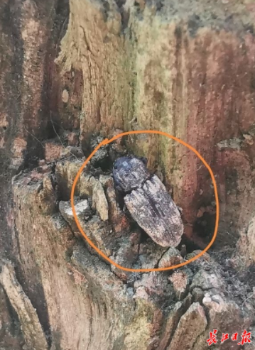 花绒寄甲的保护色跟树皮一样,很难分辨。 记者明眺生摄