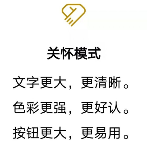 现在,点进微信,可以在我的——设置中找到并开启“关怀模式”。该模式下,字体更大、色彩更强、按钮更大,整体使用上更为清晰便利。且微信平台上,商户小程序中也开发了专门的“大字大图模式”。
