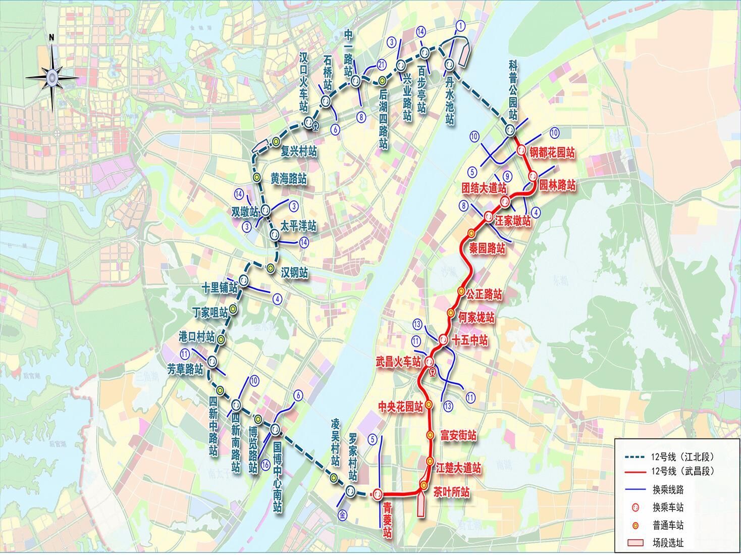 武汉地铁12号线全长59.9公里,是国内最长的城市地铁环线,连通武汉三镇,串联了硚口、江汉、江岸、青山、洪山、武昌及汉阳共7个行政区域。线路共设站37座,其中换乘站数量达26座,与18条地铁线路实现换乘。
