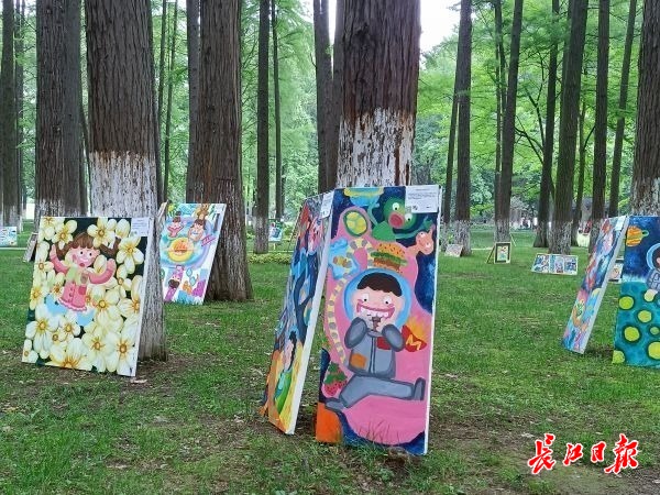 在解放公园水杉林展出的儿童画作。实习生付玥玥摄