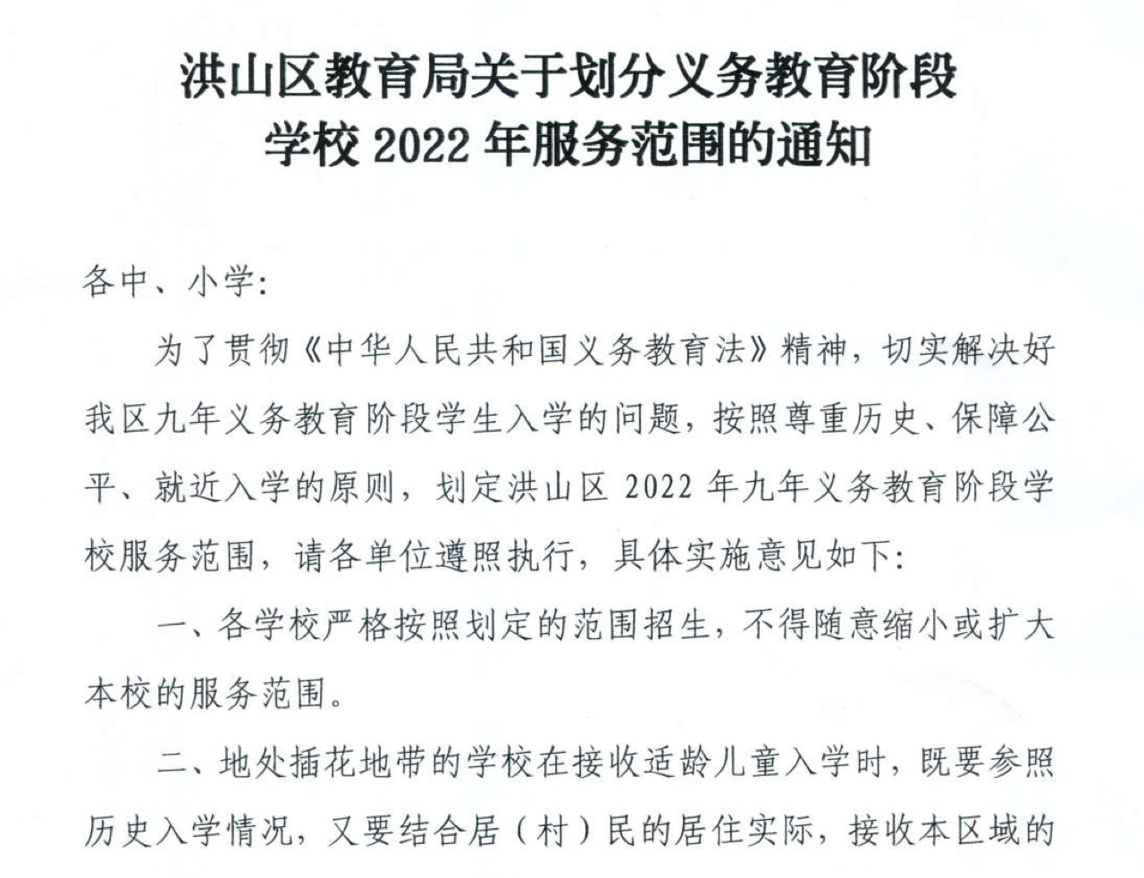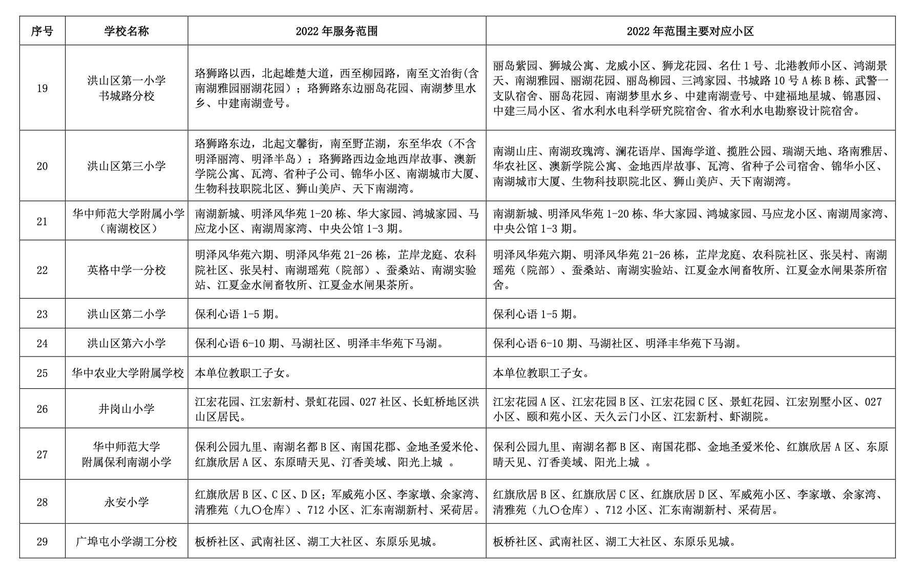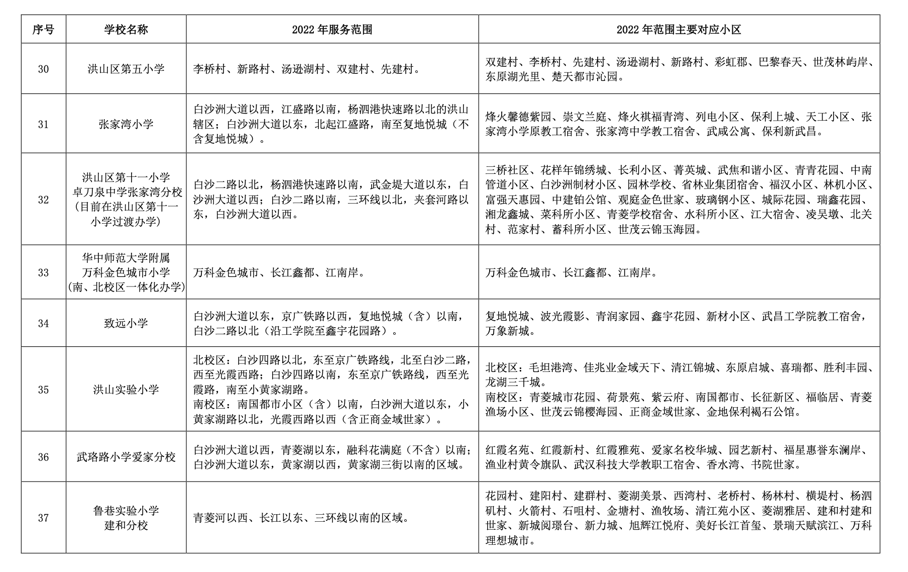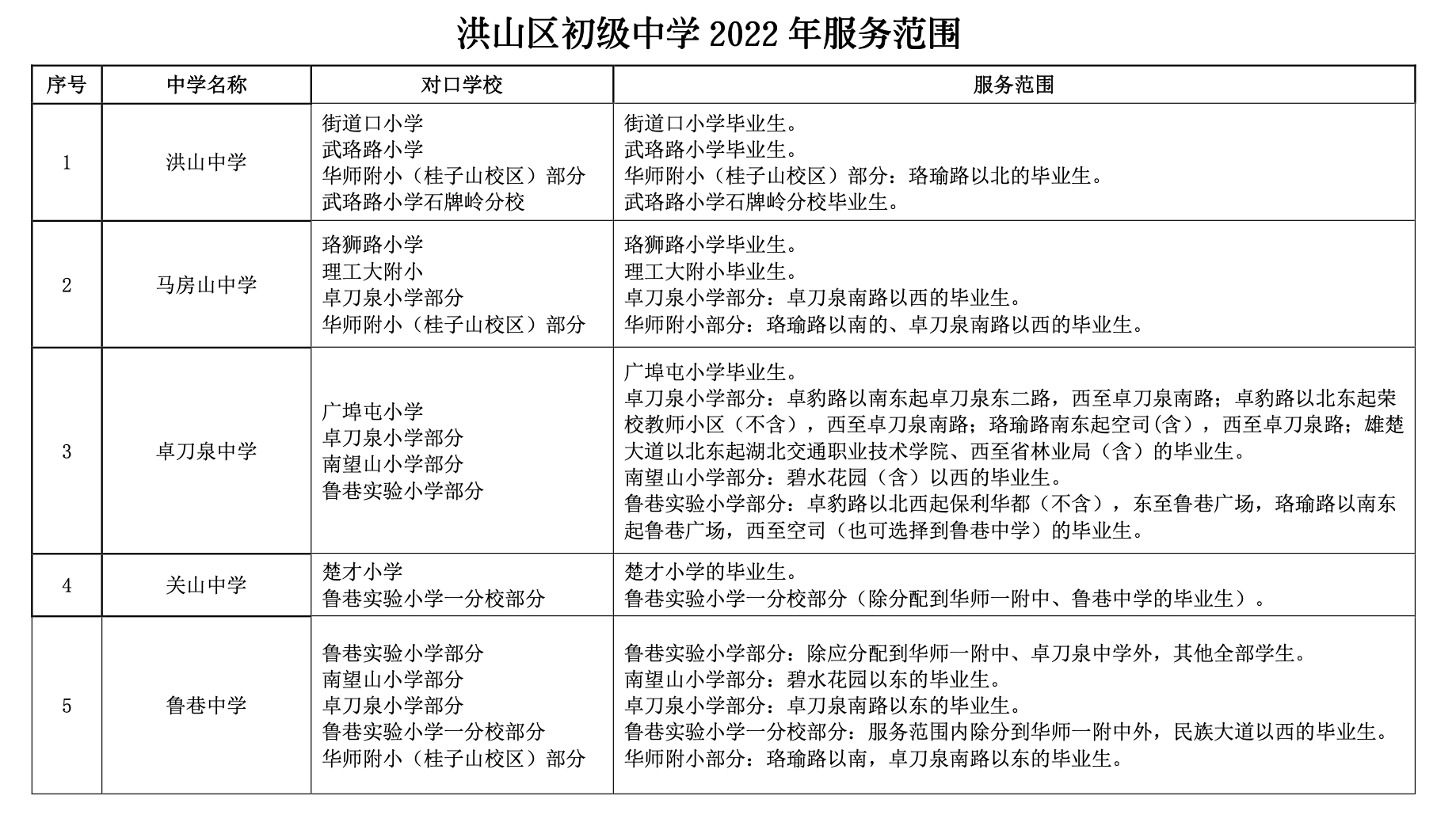 洪山区对口划片信息公布 2022-05-31 11:08 洪山区教育局 0 30日,洪山区教育局发布《关于划分义务教育阶段学校2022年服务范围的通知》,全文如下: 洪山区小学2022年服务范围: 洪山区初中2022年服务范围: 在大武汉 聊教育那些事 扫码入群 掌握新鲜的教育资讯 了解更多教育资讯请点击此处 (来源:洪山区教育局) 【编辑:郑晓晓】