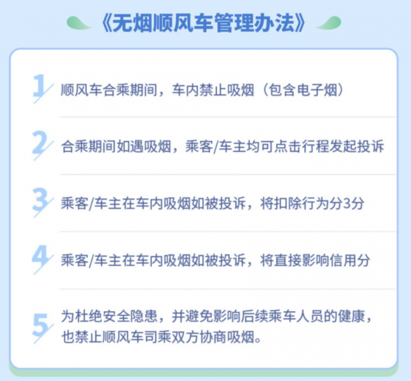 早在2019年12月嘀嗒出行推出《嘀嗒无烟顺风车管理办法》,当时抽烟将被扣除3分行为分。
