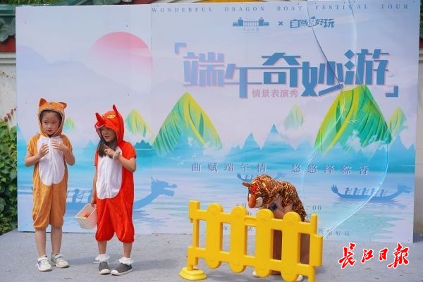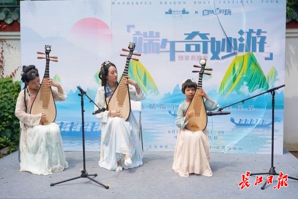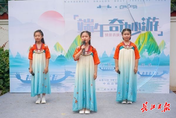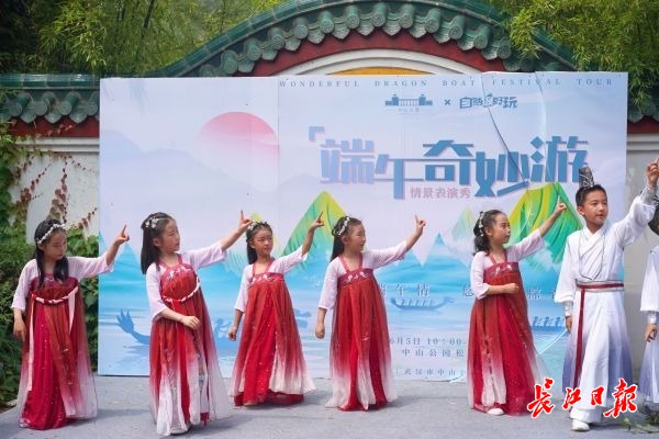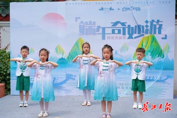 长江日报大武汉客户端6月5日讯(记者张轶 通讯员李竹轩)古筝、琵琶、儿童剧、诗歌朗诵……6月5日,正值端午假期,来自武汉市各个艺术团的30余位小朋友在中山公园松月轩上演“端午奇妙秀”情景表演秀,在游客欢声笑语中健康欢乐祥和过端午。