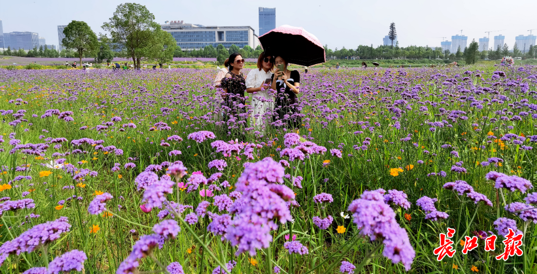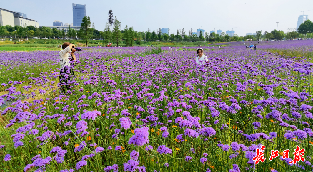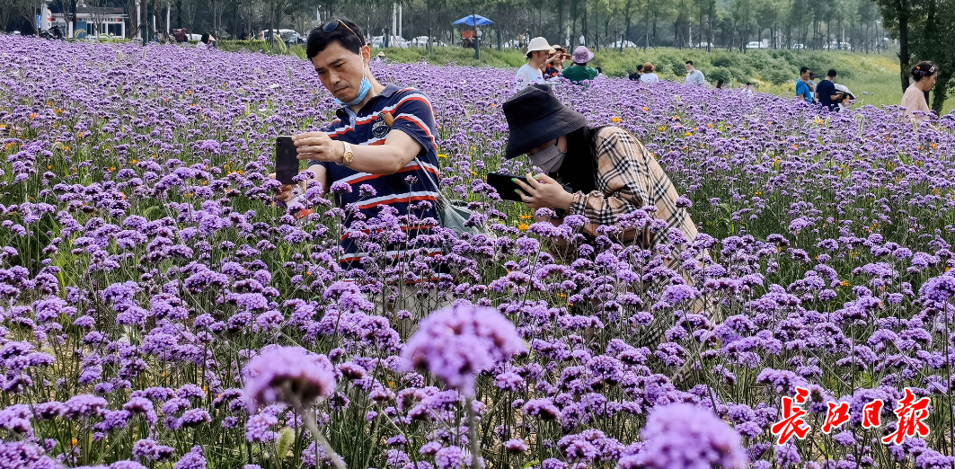 这片花海位于高新大道光谷政务服务中心对面,背靠九峰山森林动物园。5日下午,长江日报记者在现场看到,大批市民在此赏花游玩。成片种植的马鞭草错落有致,每一排花丛之间有约30厘米宽的间隔,游客可以站在其中拍照留念,不用担心损坏花草。一些摄影爱好者拿出相机、无人机等设备,记录下花海美景。
