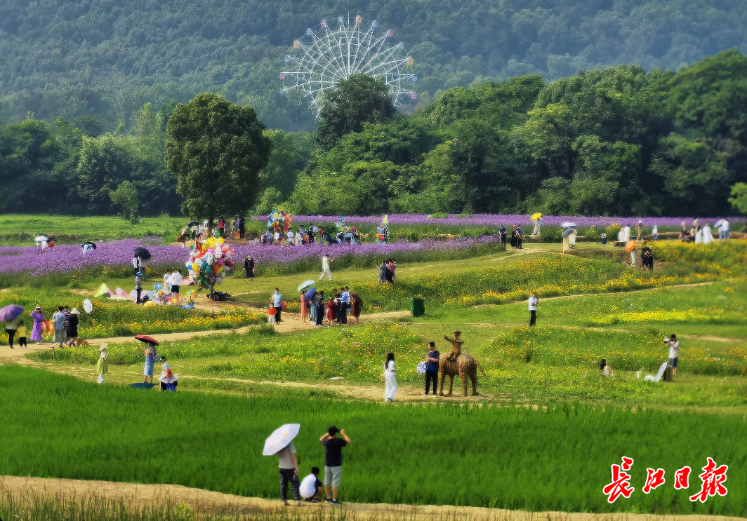 长江日报大武汉客户端6月5日讯(记者邓小龙)成片紫色的马鞭草高低起伏,浪漫的摩天轮成为拍照打卡的绝佳点缀……这几天,有市民通过武汉城市留言板留言称,光谷有一片武汉最大的马鞭草花海。