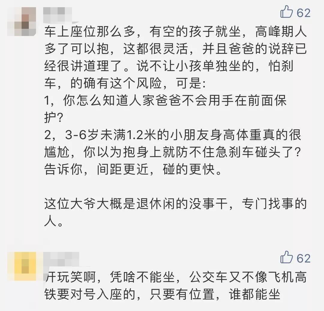 今天公交车上遇到的,爸爸带着小孩,分别坐在两个位置上,有人下车恰好还有空位,但也很多人站着,一位老人上来就对着爸爸说教,小孩子没买票就没有座位,应该由爸爸抱着,太没公德心了!