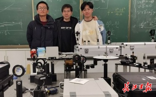 物理竞赛教练梅军(右二)和罗民睿、宋高兴。(记者刘嘉 摄)