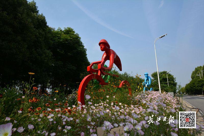 骑车人塑像奔驰在鲜花丛中。长江日报记者杨涛 摄
