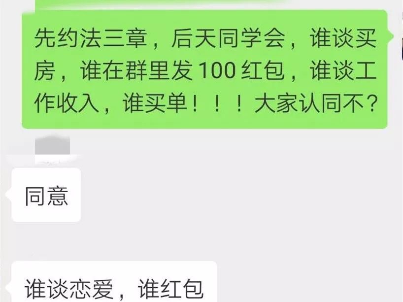 近日,湖北一中学2012届毕业生举办同学会,提前在微信群中约法三章:聚会上只谈当年情谊,谁谈及买房问题发100元红包,谈及工作和收入问题者负责买单。组织者说,毕业多年,同学之间发展各有不同,谈及买房、工作、收入等问题难免给部分同学带来压力。你怎么看?