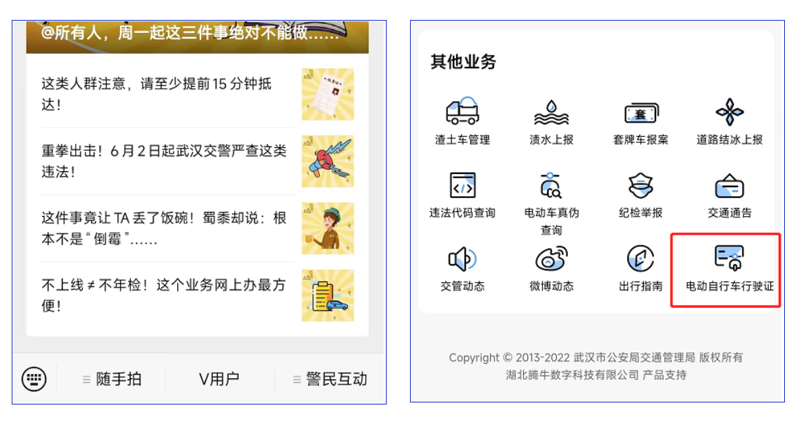 进入武汉交警微信公众号,点击菜单栏【V用户】,从其他业务中,选择【电动自行车行驶证】;