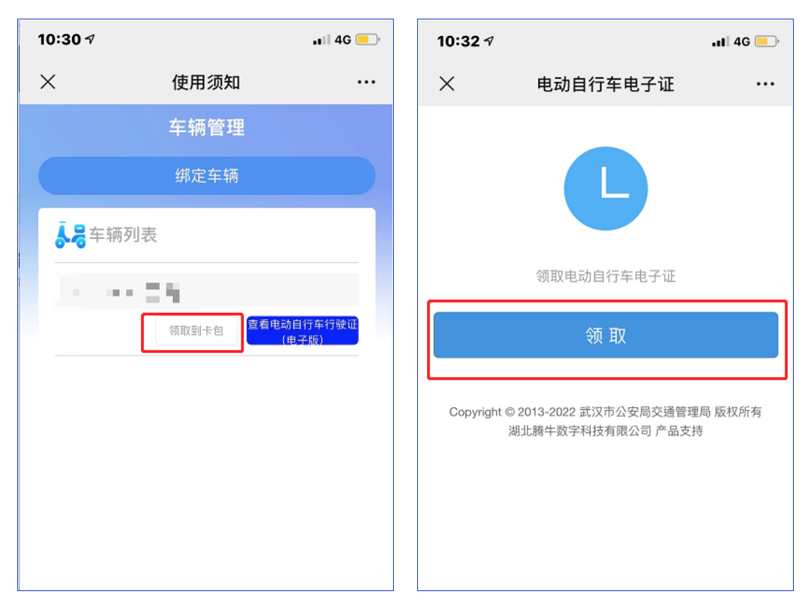 完成车辆绑定后,可以在车辆列表查看本人名下的电动自行车信息,点击【领取到卡包】。