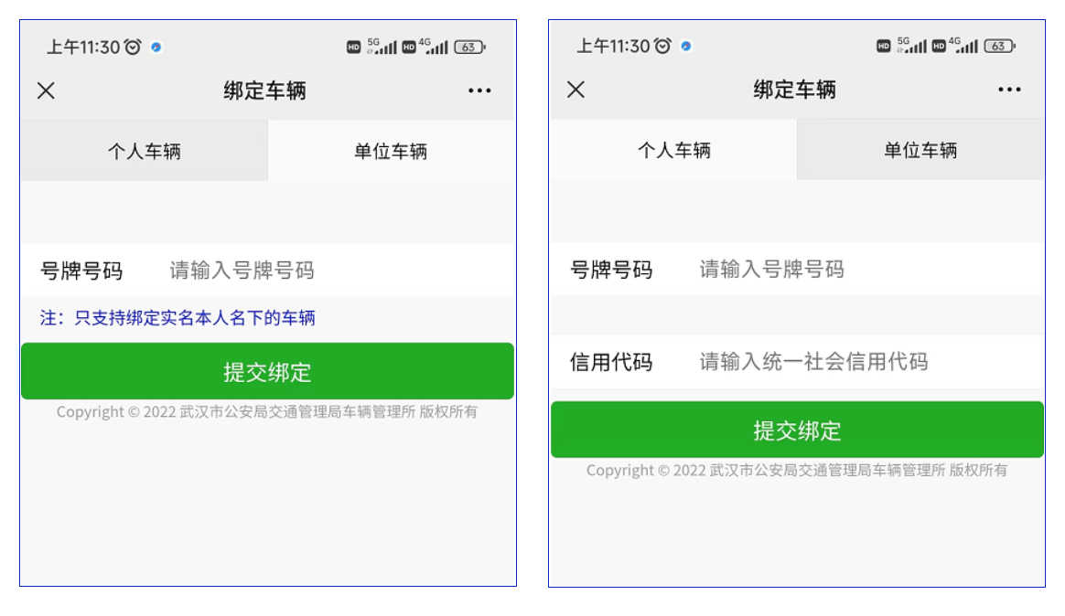选择【个人车辆】或【单位车辆】,根据要求输入车辆号牌号码、统一社会信用代码(仅单位车辆需要),即可完成绑定。