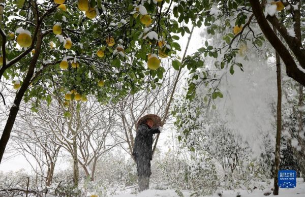 12月26日,湖南省涟源市桥头河镇大范村农民在清理果树上的积雪。新华社发(张扬摄)