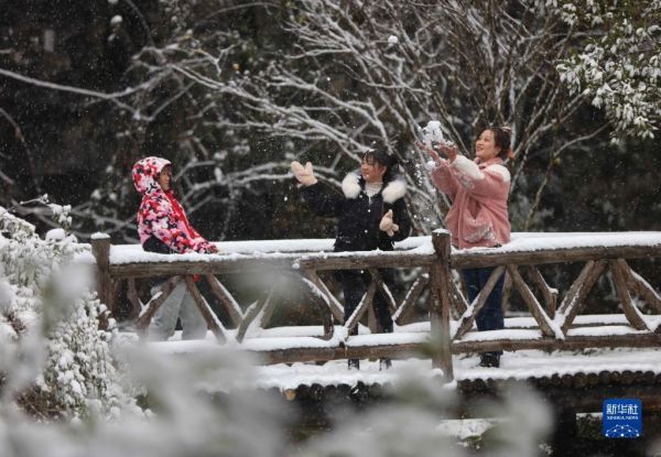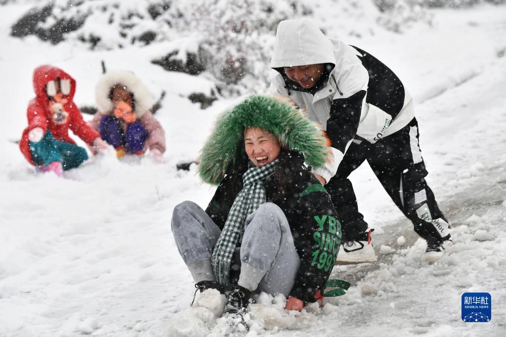12月26日,在湖南省湘西土家族苗族自治州花垣县,人们在雪中玩耍。新华社发(龙恩泽摄)