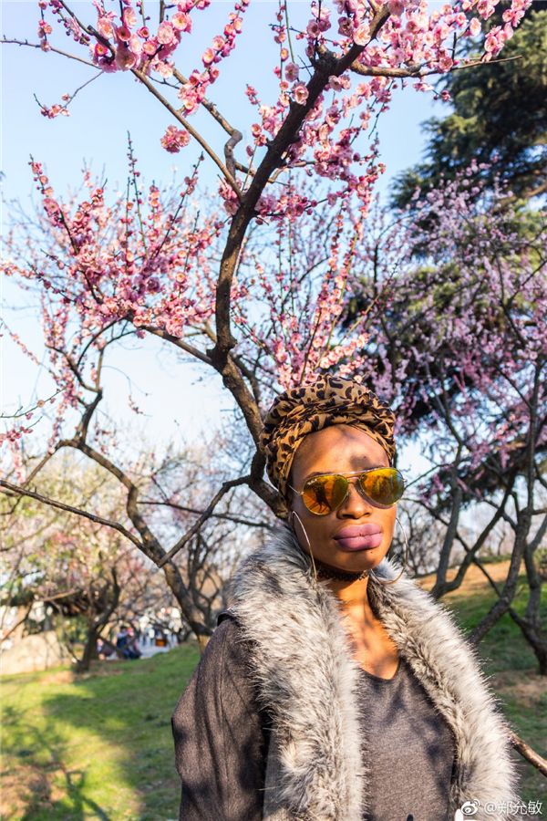 这位黑人女生的唇色和东湖磨山的樱花很搭配。