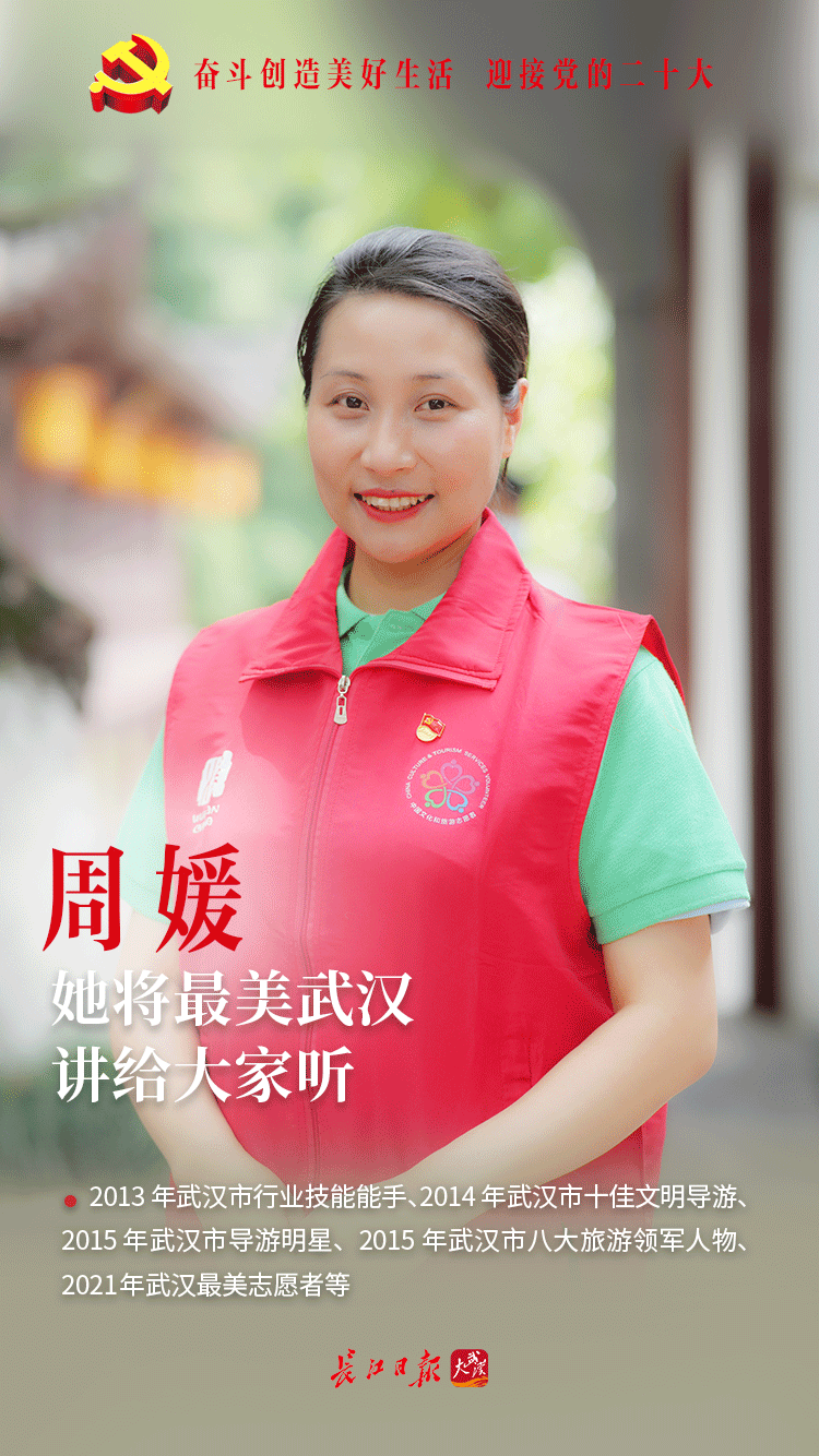 “黄鹤楼是武汉历史文化的展示窗口,游客真正了解了黄鹤楼,才能感受到武汉旅游独具的中华文化之美。”周媛投身于文旅志愿服务已有10多年的时间。周末、节假日她放弃休息,带领着志愿者团队,在景区、文化场馆进行志愿解说、提供咨询,向来往游客和市民发放文明旅游宣传资料,传递文明旅游、健康旅游观念。“志愿服务并不伟大,就是坚守在平凡岗位上做日常小事。”十年来,周媛接待了无数南来北往的游客,志愿服务时长达4986个小时。除了日常的志愿服务,周媛还投入到公益培训工作中。6月29日下午,武汉文旅志愿者应邀走进江汉区文化馆,分享志愿活动中的经验,周媛为街道的文艺骨干和江汉文化·群艺联盟团队的志愿者们讲解《志愿服务礼仪》,现场展示志愿者的仪容、着装要求。