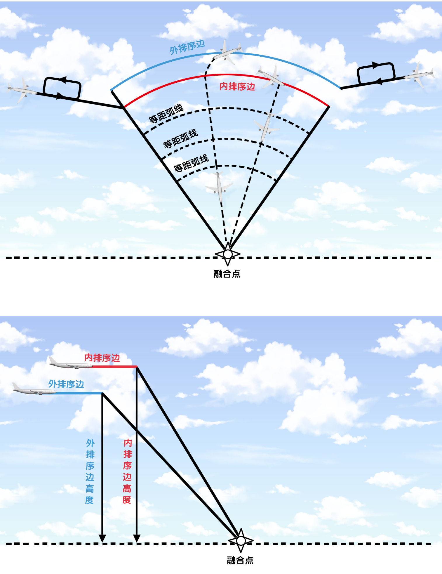 点融合是利用圆弧上任意一点到圆心距离相等这个简单的原理,为空管提供了一种高效的进近排序方法,相当于在空中划一个扇形区,让进场的飞机都先在弧线上“停”下来等待,然后听令依次出发飞向融合点即圆心。