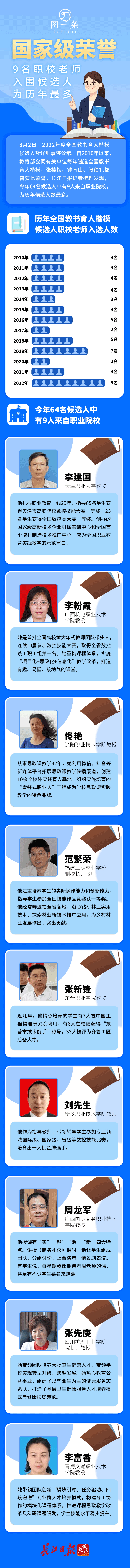 长江日报大武汉客户端8月4日讯(记者李玉莹 实习生童婉靖)8月2日,2022年度全国教书育人楷模候选人及详细事迹公示。自2010年以来,教育部会同有关单位每年遴选全国教书育人楷模,张桂梅、钟南山、张伯礼都曾获此荣誉。长江日报记者梳理发现,今年64名候选人中有9人来自职业院校,为历年候选人数最多。2010至2016年、2018年,人数在4人上下浮动,2017年、2020年均是2人,2019年7人。