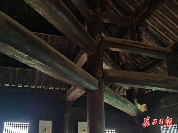 武当山博物馆馆员舒成海向探访团介绍,所谓“一柱十二梁”,就是在一根主体立柱上,支撑了十二根横梁。也就是说,承载屋顶重量的十二根梁枋,交叉叠搁穿凿于一根立柱上,无愧于“中流砥柱”的美誉。这种建筑工艺与实用功能和谐统一,构思巧妙,计算周密,既节约用材,又增大了空间,让人不得不叹服中国古人的大智慧。