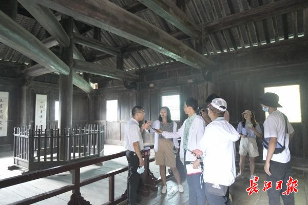 武当山博物馆馆员舒成海向探访团介绍“一柱十二梁”的独到之处。记者吕诗文 摄